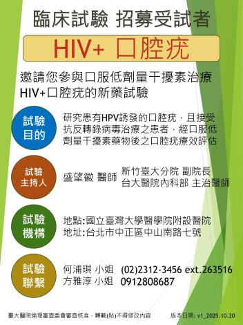【HIV+口腔疣】臨床試驗招募受試者邀請您參與口服低劑量干擾素治療HIV+口腔疣的新藥試驗試驗目的:研究患有HPV誘發的口腔疣,且接受抗反轉錄病毒治療之患者,經口服低劑量干擾素藥物後之口腔疣療效評估。試驗主持人:盛望徽醫師 &nbs ...更多