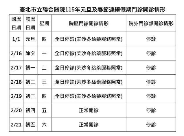 紀念日及節日假期名稱國曆日期星期院區門診開診情形院外門診部開診情形和平紀念日2/27(補假日)五全日停診停診2/28六全日停診停診兒童節&民族掃墓節4/3(補假日)五全日停診停診4/4六全日停診停診4/6(補假日)一全日停診停診勞動節5/1五全日停診停診5/2六全日停診停診端午節6/19五全日停診停 ...更多
