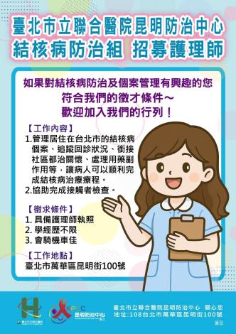 如果對結核病防治及個案管理有興趣的您符合我們的徵才條件 歡迎加入我們的行列【工作內容】1.管理居住在台北市的結核病個案、追蹤回診狀況、銜接社區都治關懷、處理用藥副作用等,讓病人可以順利完成結核病治療療程。2.協助完成接觸者檢查。【徵求條件】1. 具備護理師執照2. 學經歷不限3. ...更多